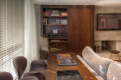 Caracterizado por linhas retas, rusticidade da madeira, toque natural e prático nos mármores travertinos da lareira e da churrasqueira, requinte através de mobiliário em laca alto brilho e espelhos facetados para jantar e hall.